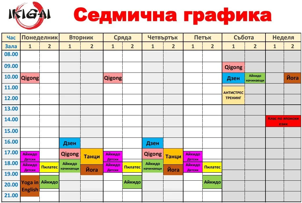 Regular weekly class times are shown below. Details on any special classes, weekend seminars, events, and so on, can be found in our Events section. To attend any regular class simply come along 15 minutes before a class starts and register at the Ikigai reception desk. Depending on the class, registration and payment can be per month or per class or for a number of classes. Family discounts are available. Generally loose clothing (tee-shirt and tracksuit bottoms) is suitable for beginners for all classes. Changing rooms, locker facilities, and parking spaces are provided.