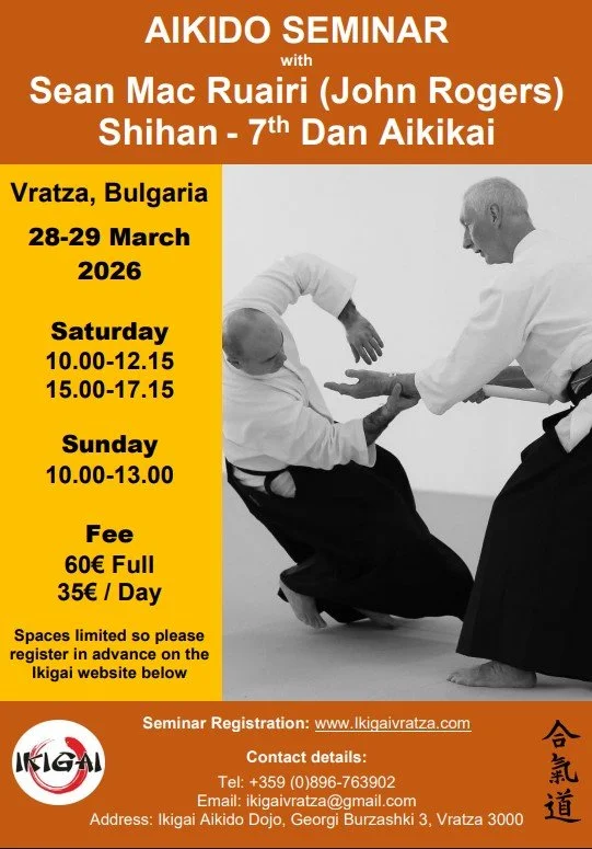 The Ikigai Center will host an international Aikido Seminar by Sean Mac Ruairi Shihan (7th Dan Aikikai) on March 28 & 29, 2026. Seminar times and fees are as per the poster below. Registration for the seminar is now open - please click on the link below.